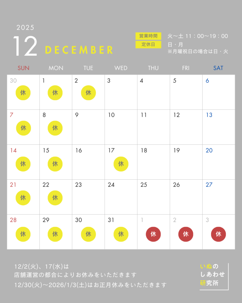 いつもご利用いただき誠にありがとうございます。 12月は定休日以外に2日(火)、17日(水)がお休みとなります。また、年末年始は12月30日(火)~2026年1月3日(土)がお休みです。 どうぞよろしくお願いいたします。